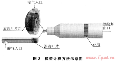 因?yàn)槿紵鲀?nèi)具有旋流葉片,而且燃燒爐體積龐大又涉及燃燒反應(yīng),因此本次模擬對(duì)網(wǎng)格精度要求較高。鑒于此,筆者將燃燒爐分為空氣室、酸氣入口管及燃燒爐爐體3部分分別進(jìn)行計(jì)算,計(jì)算示意圖如圖3所示,空氣室和酸氣入口管內(nèi)不涉及組分燃燒,此區(qū)域內(nèi)僅進(jìn)行流場(chǎng)計(jì)算,而且單獨(dú)計(jì)算時(shí)出口截面邊界條件誤差微小,對(duì)兩出口截面上速度大小和方向的整體性影響不大。計(jì)算完成后利用profile功能將上述兩結(jié)構(gòu)的出口參數(shù)導(dǎo)出,作為燃燒爐爐體的空氣及酸氣入口條件。采用此方法對(duì)燃燒爐結(jié)構(gòu)進(jìn)行模擬,可以大大減少網(wǎng)格數(shù)量,節(jié)省計(jì)算時(shí)間,并且提高計(jì)算精度。