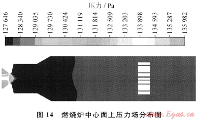 圖14為新結(jié)構(gòu)下燃燒爐內(nèi)的壓力分布圖。從圖14可以看出,壓降損失最大的區(qū)域?yàn)閲娮熘粱鹧鎱^(qū)的收斂噴口處,火焰區(qū)內(nèi)處于負(fù)壓,出口處壓強(qiáng)約128kPa,入口處壓強(qiáng)最高為136kPa。爐內(nèi)總壓降為8kPa,與忠縣天然氣凈化廠內(nèi)燃燒爐設(shè)計(jì)壓降11kPa相比,減小了3kPa。因此新結(jié)構(gòu)在滿足現(xiàn)有硫回收功能的同時(shí),能夠減小設(shè)備壓降,提高總硫回收率。
