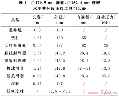 裸眼水平井分段壓裂需要的主要工具類型和參數見表1。按國際標準,投球滑套內通徑采用6.3mm梯度,分段級數小于等于6級,采用3.175mm梯度,分段級數可達到10級[1]。