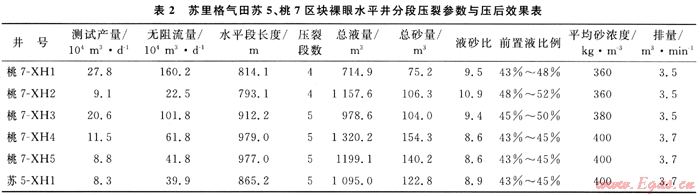 目前,蘇里格氣田蘇5、桃7區水平井分段壓裂共施工7口井,施工成功率100%,獲得平均測試產量14.8×104m3/d,平均無阻流量75.6×104m3/d,最高測試產量27.8×104m3/d,最高無阻力量160.2×104m3/d,具體設計及施工參數和壓后產量如表2所示。壓后效果證明筆者所建立的方法有效,結論正確,應用效果良好。