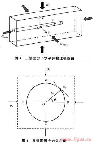 無限大地層水平鉆進后在井壁周圍會產生應力集中[2~3],其物理模型如圖3所示,并假設井筒方向與水平最小主應力方向平行。