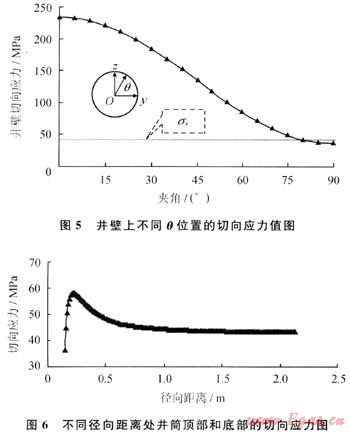 井壁圓周應力分布如圖4所示,其中徑向應力和切向應力由式(1)、(2)和式(3)計算,垂向應力由(4)式計算。