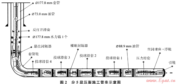為了讓裂縫在壓裂段能集中起裂,蘇里格氣田多數以雙封隔器進行單段壓裂,例如分5段使用8個裸眼封隔器,其壓裂施工管柱結構如圖2所示,反打開滑套可在壓裂施工前打開,施工時以便監測井底壓力。
