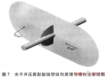 通常認為,井筒方向若平行與最小主應力,壓裂時則產生垂直井筒的橫向裂縫,而計算結果表明,在水平井井筒的頂部和底部圓周切向應力最小,為36.6MPa,比最小主應力40.2還小。因此,即使井筒方向平行于最小主應力方向,初始裂縫也不是橫向的,而是平行于井筒的縱向裂縫,那么,這種由于應力集中產生的縱向裂縫能延伸多遠,下面就計算不同r處井筒頂部和底部的圓周切向應力,其計算結果如圖6所示。計算結果表明:應力集中在4倍井筒距離及0.61m后基本消失,在超出應力集中帶后,重新產生垂直于最小主應力的橫向主裂縫(圖7)。