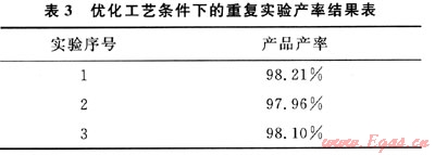 為了驗證正交實驗優化出來的工藝條件的可靠性,在該條件下又進行了3次重復實驗,得到的產率結果如表3所示。