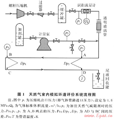 根據對天然氣管輸減阻劑性質及作用機理的研究,設計了天然氣室內模擬環道評價系統,如圖1所示。