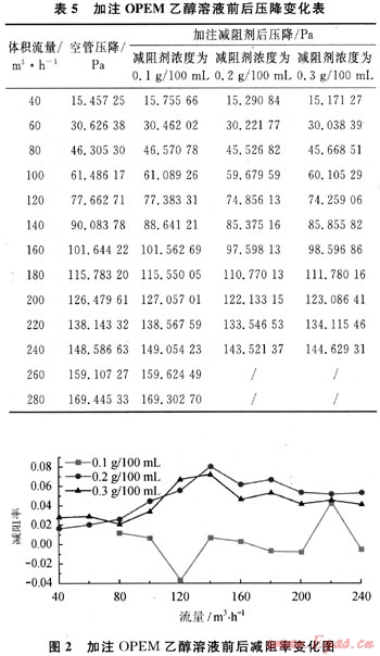 配制了3種濃度的十八醇磷酸酯單乙醇銨鹽(OPEM)乙醇溶液,依次將其注入管道中,浸泡4h后考察不同濃度、不同雷諾數下的減阻效果。結果如表5與圖2所示。