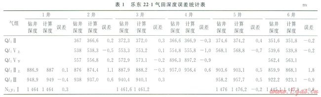 對該區速度譜有了清晰的認識后,分兩部分進行速度分析。在“模糊區”外主要解釋了高分辨率二維地震速度譜,在“模糊區”內主要用1993年常規二維地震測線的道集和部分l996年高分辨率二維地震資料進行交互速度分析拾取。速度體的建立[6]要經過速度解釋、數字化輸入等多個環節,難免會出現一些差錯,為了解決這一問題,使建立的速度體更加準確可靠,采用“INDEPTH”軟件的速度監控功能對速度資料進行了質量控制。較好地從點、線、面上找出野值或不合規律的值,經質量控制后,消除這些野值和奇異點,使地震速度更加準確可靠,對比各井VSP速度與井旁地震速度譜速度發現,兩種速度非常接近,雖然仍有一定的誤差,但已完全可以滿足精度要求。把經質量控制后的速度數據進行格式轉換,用“EARTHVISION”軟件進行三維網格化(網格間距為250m×250m×20ms),再用6口井的VSP速度進行校正,獲得了準確可靠的地震速度體[10]。將該速度體轉換的深度構造圖與井點實鉆進行比較,其絕對誤差最大為l.8m,精度較高(表1)。