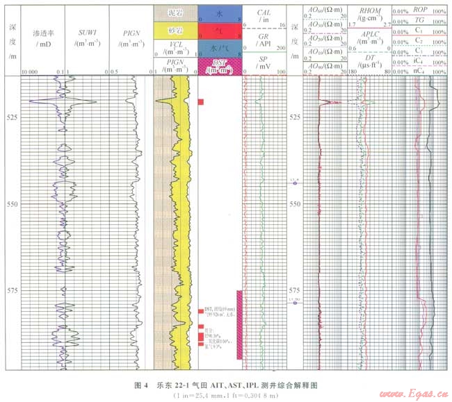為了提高薄氣層厚度的解釋精度,引進陣列感應測井[12](Array Induction Tool,簡稱AIT)、方位電阻率測井[13](Azimuthal Resistivity Imager,簡稱ARI)、綜合孔隙度測井(Integration Porosity Log,簡稱IPL)提高了薄層厚度的解釋精度。如圖4中在519.7~521.4m,氣層段由于侵入影響AO90電阻率值明顯高于常規感應電阻率值6W·m左右;而在580.0~591.0m氣層段為砂泥巖交互層段AO90電阻率曲線明顯顯示了砂泥巖薄互層的特性,薄砂層電阻率明顯高于常規感應電阻率值,而常規感應電阻率曲線只反映了薄互層的平均電阻率值,同時,AST、IPL等曲線也顯示了與之對應的砂泥巖薄互層的特性。