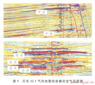 這一評價思路慕于以下幾點認識:①“模糊區”的形成可能是由淺層氣屏蔽和熱流體造成;②“模糊區”在時間剖面上的下凹,很可能是速度陷阱造成的假象,可能是構造的高部位;③從沉積相分析,該區儲層可能是連片分布的,也就是說“模糊區”內可能存在儲層;④該區域已發現的東方1-1氣田和樂東l5-1氣田的含氣范圍在地震資料上都有平點或亮點等異常特征,該氣田可能也存在這一特征。