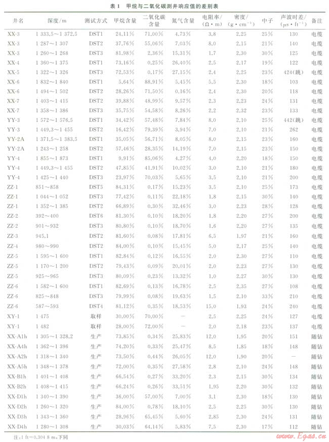 烴類氣與二氧化碳氣層在測井曲線上的響應特征與油、水層有較明顯的區別,而它們兩者之間的差異卻較小,這是造成用測井資料區分甲烷和二氧化碳困難的根本原因。但通過對二者理論上測井響應值的研究可知,兩者還是存在一定的差別,因而兩種氣體在測井曲線上必定存在或多或少的差異,這是用測井資料定性、定量區分烴類氣與二氧化碳氣的基礎[4]。