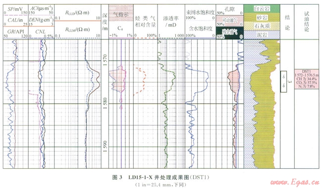 圖3顯示LDl5-1-X井1572~1577m段第2道中子密度出現交會,第3道電阻率增大,第5道孔隙度差、比值識別法出現明顯的氣層“包絡”特征,第8道測井計算的含水飽和度與束縛水飽和度幾乎重合,含水飽和度大致為30%,第6道為該方法定量計算出的烴類氣相對含量,大概在40%左右,DST測試證實該層甲烷含量為34.4%,測試的結果與定量計算的結果相近。