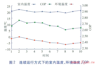 連續運行方式的實驗時間為l個月,每天運行24h,每小時監測記錄一次。以每3天為單位取室內溫度、COP、環境溫度平均值,結果見圖2。其中橫坐標值1代表實驗的第l~3天,2代表實驗的4~6天,依此類推。在此運行模式期間,平均室外溫度為-3.47℃,最低日平均溫度為-6.6℃,最高日平均溫度為0.0℃,太陽輻射平均日總量為2353W/m2,集熱器平均日集熱總量為l411.8W/m2,室內溫度在19.2~22.7℃范圍內變化(平均達21.15℃),系統的平均COP達2.689,COP最低為2.614,最高為2.782。從圖2可知,系統連續運行時的供暖溫度始終在人體舒適的溫度范圍內波動,但是系統的COP值較小,說明能耗還可以進一步降低。