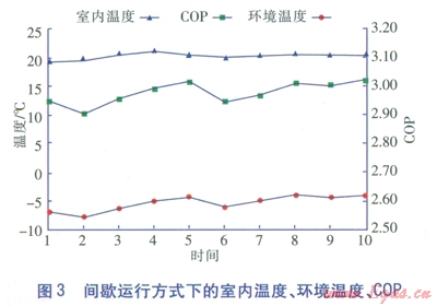 間歇運行方式試驗時間同樣為1個月,每小時監測記錄一次,同樣以每3天的數據做一次平均值計算,得到室內溫度、COP、環境溫度的平均值,見圖3。圖3中的橫坐標值意義與圖2相同。在此運行模式期間,平均室外溫度為-5.581℃,最低日平均溫度為-7.9℃,最高日平均溫度為-4.8℃。太陽輻射平均日總量為2123W/m2,集熱器平均日集熱總量為l273.8W/m2。室內溫度保持在19.1~20.7℃(平均達19.87℃)。系統平均COP達2.979,COP最低為2.90,最高為3.03。由圖3可知,系統間歇運行時COP有所提高,供暖溫度也在合適范圍內波動,但是較連續運行方式有所下降。