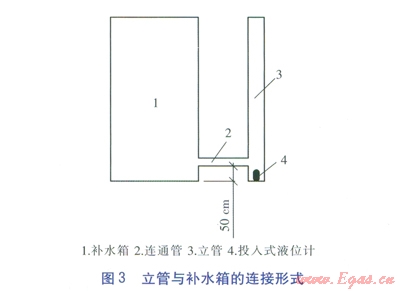 增設立管與補水箱底部連通,將投入式液位計沉入立管底部,具體連接形式見圖3。由于補水箱底部的水溫較低,因此投入式液位計所在位置的水溫也較低,能基本滿足其設計溫度工作。