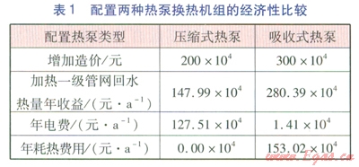 配置兩種熱泵換熱機組的經濟性比較見表l,熱價按57.92元/GJ計算,電價按0.854元(kW·h)計算。由表1可計算得,配置壓縮式熱泵的換熱機組年凈收益為20.48×104元/a,增加造價200×104元,投資回收期約l0a。配置吸收式熱泵的換熱機組年凈收益為l25.96×104元/a,增加造價300×104元,投資回收期約3a。