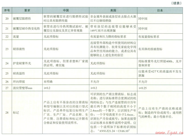 (6)對(duì)耐溶液性我們的標(biāo)準(zhǔn)沒(méi)有明確要求,美國(guó)和日本標(biāo)準(zhǔn)都有要求,我們需要根據(jù)我國(guó)的實(shí)際制定相關(guān)的要求,包括耐紫外光,建議在以后標(biāo)準(zhǔn)修訂時(shí),能夠參考日本的標(biāo)準(zhǔn)制定適合我國(guó)國(guó)情的相關(guān)要求,如耐溶液性除了常用的油鹽醬酷外,包括清潔用的除油劑和洗滌劑,耐紫外光可以直接采用日本標(biāo)準(zhǔn)的相關(guān)部分。因?yàn)橹袊?guó)的塑料原材料生產(chǎn)比較混亂,塑料的成分沒(méi)有統(tǒng)一的標(biāo)準(zhǔn),而且檢測(cè)它的化學(xué)成分難度比較大,尤其足用舊的塑料回用,性能明顯下降,但是很難識(shí)別,原材料廠(chǎng)家的檢測(cè)報(bào)告都是通過(guò)標(biāo)準(zhǔn)樣塊送檢,沒(méi)有可比性,我們應(yīng)盡快制定相關(guān)的技術(shù)指標(biāo)及試驗(yàn)方法,針對(duì)波紋軟管成品進(jìn)行檢測(cè)。