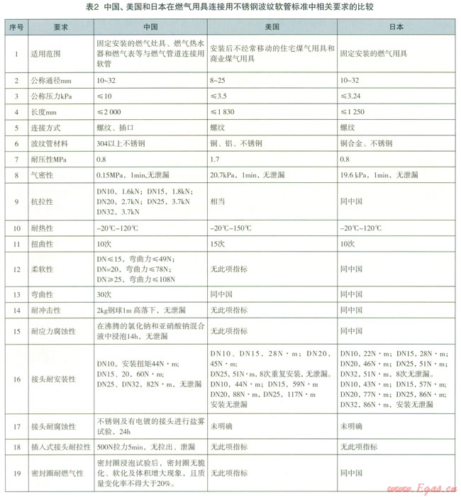 最早的CJ/T l97—2004《燃?xì)庥貌讳P鋼波紋軟管》標(biāo)準(zhǔn)把燃具用連接軟管和輸送管道用軟管放在了一起,技術(shù)性能要求也基本一致,在后來(lái)的實(shí)際應(yīng)用中出現(xiàn)了問(wèn)題:輸送管道用軟管在疲勞試驗(yàn)方面的彎曲性能要求不需要很高,但是對(duì)波紋管管體的強(qiáng)度和使用壽命要求相應(yīng)更高;而燃具連接用軟管需要柔軟性好,對(duì)彎曲和扭曲的疲勞壽命也要求更高。同時(shí),經(jīng)過(guò)國(guó)內(nèi)廠(chǎng)家的努力,我們的設(shè)計(jì)水平和制造工藝也大大縮小了和美國(guó)、日本的同類(lèi)產(chǎn)品的差距,而美國(guó)和日本對(duì)這兩種產(chǎn)品有不同的標(biāo)準(zhǔn),見(jiàn)表1。在中國(guó)市政工程華北設(shè)計(jì)研究總院相關(guān)領(lǐng)導(dǎo)和專(zhuān)家的努力下,按照產(chǎn)品的使用功能把一個(gè)標(biāo)準(zhǔn)分成兩個(gè)標(biāo)準(zhǔn),是非常及時(shí)和必要的。