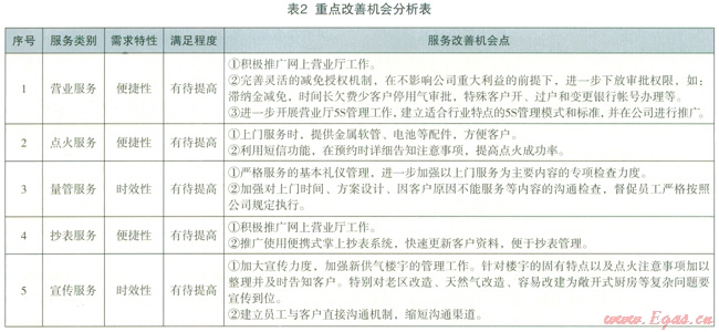 在通過上門服務、專項調查、定期走訪、業務回訪、服務熱線、營業咨詢、市長熱線、民心橋等多種信息收集手段的基礎上,對l0大服務類別的3層次需求特性進行滿足度分析(見表l)。細分各項服務滿足客戶需求程度是尋找服務改善點的基礎。