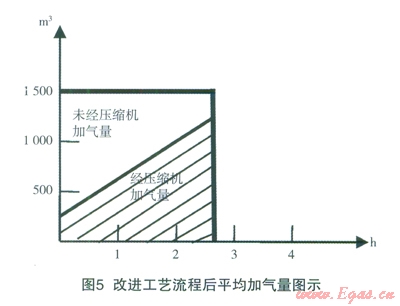 改進工藝流程平均加氣量圖示:上部為管束氣瓶直接加入CNG汽車天然氣氣量,下部為經壓縮機壓縮的加氣量;改進工藝流程后加氣量由1000m3/h增加到1500m3/h;一輛管束車卸氣時間由原4h/車縮短到3h/車以內;改進工藝流程后相對減少了壓縮機開機時間,減少了壓縮機的磨損并降低了能耗,實現了壓縮機在原有排氣量不變情況下提高加氣量的目的。