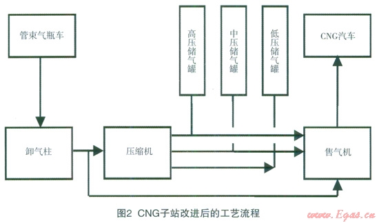 管束氣瓶中天然氣經卸氣柱后分為二路流動:一路連接到壓縮機進氣管,當中壓儲氣罐低于設定值時,壓縮機進入工作狀態(原流程);第二路在壓縮機進氣口前增設一管線直接單獨進入加氣機低壓加氣系統。在任何時候管束氣瓶中天然氣都直接進入加氣機低壓系統,加氣機低壓氣不再經過壓縮機。從管束氣瓶接入子站開始運行至卸氣結束時間,一直利用管束氣瓶中天然氣自身壓力通過低壓電磁閥向CNG汽車加氣,當CNG汽車鋼瓶壓力達到設定壓力或流量小于設定值時,通過電磁閥自動轉換,再取中、高壓罐中天然氣向CNG汽車充氣,直到CNG汽車鋼瓶中天然氣壓力達到20MPa時,單車加氣完成。