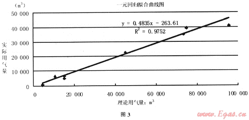 理論用氣量與實際用氣量的相關系數r=0.988,線性關系顯著。一元回歸方程為y=0.4835x-263.61,擬合度曲線如圖3。
