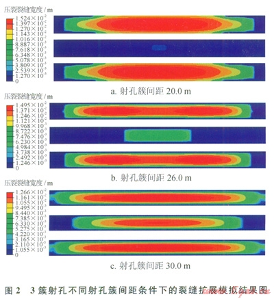 筆者模擬了2簇、3簇和4簇射孔在不同的射孔簇間距條件下的裂縫擴展,圖2所示為3簇射孔、不同的射孔簇間距條件下的擴展結果,圖2-a為射孔簇間距為20.0m時的裂縫擴展結果,中間的射孔簇只能開啟小段距離后就發生止裂,不能形成有效裂縫;圖2-b所示的為射孔簇間距為26.0m時的裂縫寬度圖,中間的射孔簇產生的壓裂裂縫能擴展一段距離,但是裂縫的艮度有限,不到兩端射孔壓裂裂縫的一半;圖2-c所示的是射孔簇間距為30.0m時的裂縫擴展結果,中間的裂縫長度只比兩端的裂縫略短,形成了有效裂縫。