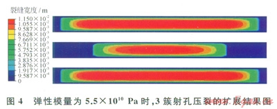 儲層的彈性模量增大,壓裂裂縫寬度降低,這樣會降低射孔簇間的干擾,增加中間射孔簇壓裂裂縫的長度。圖4所示的是3簇射孔、彈性模量為5.5×1010Pa時的裂縫擴展情況,圖2-b所示的是3簇射孔、彈性模量為3.5×1010Pa時的裂縫擴展情況,可以發現:儲層彈性模量增大2.0×1010Pa時,中間射孔簇的裂縫長度增加了53.0m,中間裂縫形成了有效裂縫。