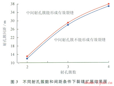 假設中間射孔簇形成的壓裂裂縫長度達到兩端裂縫的一半以上,認為中間裂縫形成了有效裂縫。不同射孔簇數、簇間距條件下的裂縫擴展情況如圖3所示,從圖3可以看出:射孔簇數增加,能形成有效裂縫的極限間距增加,且增加幅度較大;射孔簇數為2簇,極限干擾距離為13.0m;射孔簇數增加到4簇,極限十擾距離增加到38.0m。