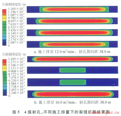 圖5所示的是4簇射孔、射孔簇間距為38.0m,施工排量分別為l2.0m3/rain和l6.0m3/min時的裂縫擴展情況,施工排量增大4.0m3/min,中間裂縫的長度發生了明顯變化;施工排量為l6.0m3/min、4簇射孔條件下,中間射孔簇無法形成有效裂縫。