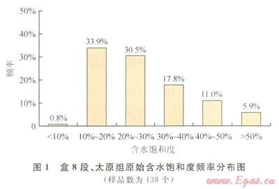 儲層原始含水飽和度由密閉取心井確定。通過統計、分析盆地東部3口密閉取心井盒8段、太原組的138個原始含水飽和度數據,結果表明,盒8段、太原組的原始含水飽和度主要分布在40%以下,累計頻率町達83.1%,平均含水飽和度為26.7%(圖1)。具有較低的原始含水飽和度特征。