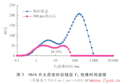 核磁共振呵動流體實驗原理是通過對儲層孔隙流體中氫核信號的觀測,可以贏接測量巖石中流體特性。并能獲得儲層有效孔隙度、自由流體和束縛流體體積、孔隙結構等地質信息[8-12]。巖心樣品飽和流體后置于均勻分布的靜磁場中,流體中的氫核(1H)會被磁場極化,產生磁化矢量,此時對樣品施加一定頻率的射頻場,就會產生核磁共振;撤掉射頻場就會接收到氫核在孔隙中做弛豫運動幅度隨時間以指數函數衰減的信號。核磁共振信號衰減的快慢采用橫向弛豫時間T2來描述,飽和流體的巖樣進行核磁共振T2測試時,T2弛豫時間的大小取決于流體分子受孔隙固體表面作用力的強弱,因此利用核磁共振了T2譜可對巖樣孔隙內流體的賦存狀態進行分析,能夠定量測試出可動流體飽和度及束縛流體飽和度。圖3為Shl6井太原組砂巖儲層核磁共振實驗的T2弛豫時間譜圖,可以確定,該砂巖儲層的束縛水飽和度為28.33%。