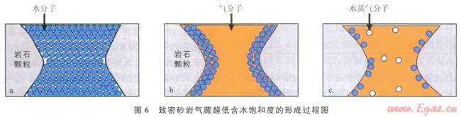 致密砂巖超低含水飽和度的形成過程如圖6所示,圖6-a為儲層早成巖期的機械壓實階段,此時干酪根未成熟,儲層孔喉中100%飽含地層水;圖6-b為儲層的可動水排出階段,此時隨著干酪根成熟度的增加,生成的天然氣注入儲集層,驅替儲層的可動水,儲層的含水飽和度接近于儲層的束縛水飽和度;圖6-c為束縛水蒸發氣化階段,此時隨著溫度壓力的增大和干氣的注入,使儲層的束縛水被蒸發氣化,不斷隨著天然氣的運移攜帶出儲層,從而形成超低含水飽和度氣藏。