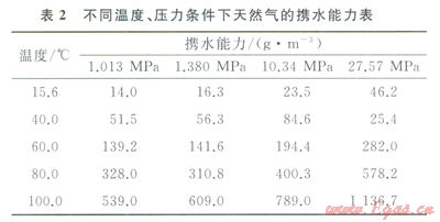 氣藏形成跨越相當長的地質時間,地層條件下氣藏中天然氣中的含水量取決于地層的溫度和壓力。在氣藏形成初期,溫度和壓力較低,但隨著埋藏深度增加,溫度壓力升高,天然氣攜水的能力不斷增強(表2),據Bennion[13]等研究,27.57MPa、100℃時天然氣蒸發和攜帶水的能力為ll36.7g/m3,而在1.013MPa、15.6℃時的能力僅為14.0g/m3,隨著溫度、壓力的增大,天然氣攜水的能力顯著增加。