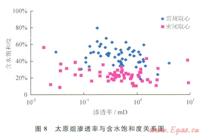 只要進入儲層的水相流體的飽和度超過儲層水相流體的原始飽和度,就會引起儲層水鎖傷害。通過密閉取心含水飽和度與常規取心含水飽和度對比發現:太原組和盒8段密閉取心含水飽和度一般低于40%(圖7、圖8);在不同滲透率區間,密閉取心含水飽和度均小于常規取心含水飽和度,表明鄂爾多斯盆地東部致密儲層普遍存在吸水現象及水基鉆井液的傷害,鉆井過程就已普遍存在著水鎖傷害。