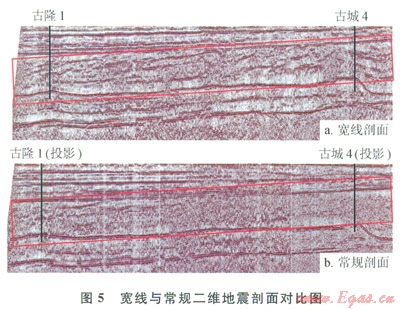 2008年首次在臺盆區沙漠腹地開展寬線攻關,采集了2條共l47km的寬線,一條是古隆1—古城4井的連井剖面,一條是過古城6號構造的近南北向剖面。寬線攻關目的有兩個:①尋找層間巖溶儲層的地震依據;②降低三維地震部署風險。實施效果表明寬線攻關效果顯著,主要表現為資料品質有較大程度改善,古城4與古隆地區油氣顯示層位大體相當(圖5),大大提高該區的地質認識,為三維地震部署提供了依據。
