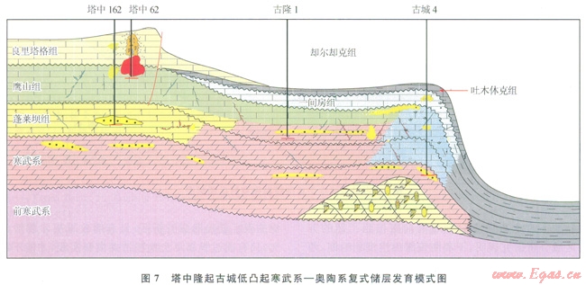 古城4井盡管失利,但其鉆后認識對古城低凸起深層勘探具有深遠的意義:①證實了古城臺緣帶的存在。中下奧陶統則為典型的臺地邊緣淺緩坡中低能砂屑灘與灰泥丘相沉積,上寒武統為臺地邊緣上斜坡垮塌沉積;②鉆揭下古生界優質儲層,測井解釋l類儲層厚38.5m,Ⅱ類儲層厚l8m,Ⅲ類儲層厚45.5m;③鉆揭含瀝青層系若干套,特別是在寒武系白云巖段發現角礫狀瀝青,熱演化程度高(R。值基本大于3.0%),表明該區曾經古油藏規模聚集,但遭受熱作用破壞;④全井見氣測顯示119m/6層,且中奧陶統測試獲得低產氣流,表明在該區存在晚期成藏事件。