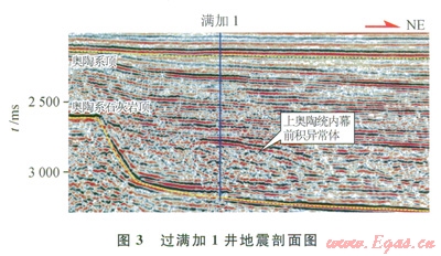 3)上奧陶統斜坡~陸棚相濁積巖在地震剖面上表現為異常反射或內幕強反射,曾是多l5井的兼探層系。1995—2003年,通過塔中28、塔中29、塔中32、塔中33、滿南1等5口探井實鉆,認為除塔中33井上奧陶統內幕強反射被證實為玄武巖外,其他內幕強反射異常體皆為濁積砂巖沉積特征。2006年,發現滿加1井上奧陶統內幕異常反射體,并認為是濁積砂巖沉積,針對上奧陶統濁積砂巖巖性圈閉鉆探滿加1井(圖3),實鉆表明上奧陶統內幕異常反射與強反射是泥質灰巖的響應,以失利告終。盡管其間也有部分井鉆遇奧陶系碳酸鹽巖,也均未獲得突破。