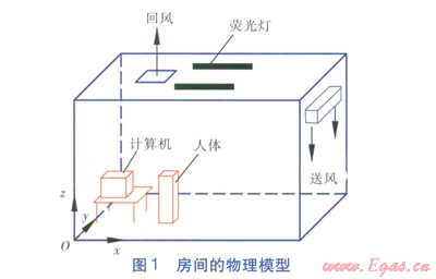 房間的物理模型見圖1,房間的長×寬×高為3.40m×2.90m×2.95m。房間圍護結構視為絕熱,送風裝置安裝于側墻上部,送風口高度為2.2m。回風口位置見圖l,尺寸為0.4m×0.4m。模型房間內有2盞熒光燈,電功率均為36W。人體、計算機等熱源靠近回風口一側的墻邊,人體和計算機的發熱量分別為l00W/人、300W/臺。將房間內的人體、計算機、桌子等分別簡化成規格不同的立方體,簡化后房間內物體具體數量及尺寸見表1。