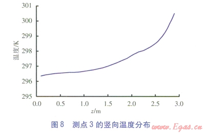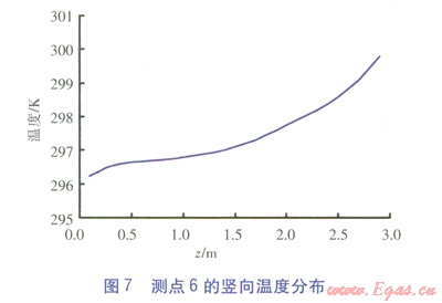 測點6、3、1¢的豎向溫度分布分別見圖7~9。由圖7~9可知,3個測點的溫度沿高度方向(三軸方向)逐漸增大。對于測點6、3,在0.1~1.2m高度范圍內溫度緩慢升高,當高于1.2m后溫升速度較快。對于測點l¢,在0.1~2.0m高度范圍內溫度緩慢升高,在0.2~1.5m高度范圍內溫度出現波動,這一高度區域恰好與坐姿下的人體腳踝到高于頭頂30cm一段吻合。當高于2.0m后,溫升速度較快。