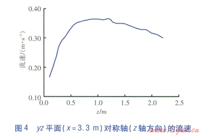 yz平面(x=3.3m)速度云圖見圖3,yz平面(x=3.3m)對稱軸(z軸方向)的流速見圖4。由圖3、4可知,貼附射流的流速沿射程方向呈現先增大后減小的變化趨勢。這種變化是貼附射流在發展的過程中,受豎向慣性力和豎向浮升力共同作用的結果。由于送風溫度較低,在出口階段氣流密度較大,氣流豎向慣性力作用比豎向浮升力作用明顯,因此對氣流起著加速作用。隨著貼附射流的發展,氣流溫度升高,豎向浮升力作用加強以及氣流接近地面時受阻,流速逐漸下降。