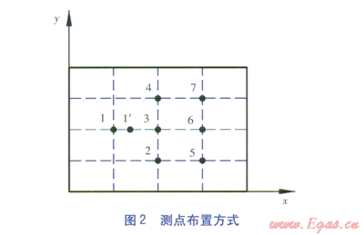 均勻分割xy平面,布置測點,獲取各測點不同三坐標上的模擬數據,測點布置方式見圖2。其中測點5~7為貼附射流空間的測點,我們選取測點6作為射流空間的代表測點;測點2~4為人體活動區的測點,我們選取測點3作為人體工作區的代表測點;選取測點l為熱源附近測點,但由于測點1被人體占據,因此我們選取測點1¢作為熱源附近測點,x、y軸坐標為(1.20m,1.45m)。