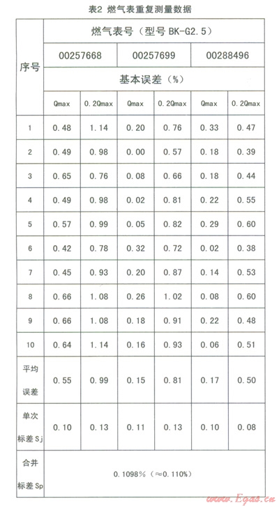 取三臺B級BK-G2.5型的皮膜式燃?xì)獗?,選擇Qmax(4.0m3/h)和0.2Qmax(0.8m3/h)兩個流量點(diǎn)連續(xù)測量10次得到6組測量數(shù)據(jù)(見表2),計算每組測量列的平均誤差di,然后按照貝賽爾公式可以算出每組測量列的單次實(shí)驗(yàn)標(biāo)準(zhǔn)差Sj,再推算出6組實(shí)驗(yàn)標(biāo)準(zhǔn)差的合并樣本標(biāo)準(zhǔn)差Sp,則有:u(v1)=Sp