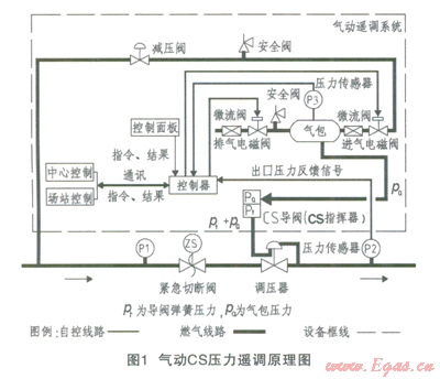 CS壓力遙調(diào)系統(tǒng)屬氣動壓力遙調(diào)系統(tǒng),它根本原理是通過遠程控制氣包上安裝的兩個電磁閥的啟閉進而調(diào)整氣包的壓力,氣包的壓力通過反饋管引至調(diào)壓器的導(dǎo)閥來調(diào)整出站壓力。其原理圖見圖1。