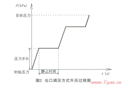 (2)自動調(diào)壓的出口調(diào)壓功能。通過設(shè)置壓力步長、靜止時間、目標(biāo)壓力等狀態(tài)參數(shù)在站控室的控制面板上進行壓力調(diào)整,通過出口壓力的反饋值調(diào)整比對,最終達到設(shè)定的出口壓力。其調(diào)整的過程見圖2。