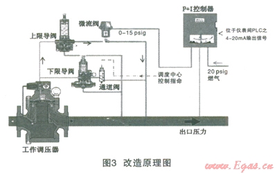 根據(jù)門站CS遙調(diào)系統(tǒng)三年左右的運行情況,發(fā)現(xiàn)氣動方式的壓力遙調(diào)在運行穩(wěn)定性、維護維修工作量等方面優(yōu)于電動壓力遙調(diào)系統(tǒng),因此本次改造定位在氣動方式。次高/中壓調(diào)壓站的壓力遙調(diào)系統(tǒng)在國內(nèi)實施尚屬新技術(shù),而在香港中華煤氣的調(diào)壓站,壓力遙調(diào)系統(tǒng)已使用多年,運行良好。其設(shè)計的理念與我們的需求是很吻合的。在香港中華煤氣的幫助下,制定了技術(shù)方案,并與原CS壓力遙調(diào)系統(tǒng)進行了比較、優(yōu)化壓力遙調(diào)的方案。本次改造的壓力遙調(diào)技術(shù)方案的原理見圖3。