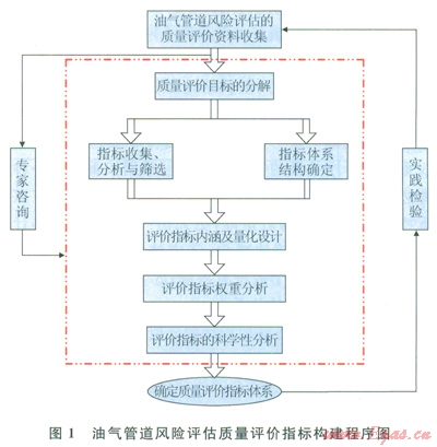 油氣管道風(fēng)險(xiǎn)評估質(zhì)量評價(jià)指標(biāo)體系的建立是一個(gè)反復(fù)的過程,涉及資料收集、評價(jià)目標(biāo)分解、指標(biāo)體系結(jié)構(gòu)確定、指標(biāo)的收集和篩選、指標(biāo)內(nèi)涵及量化性設(shè)計(jì)、指標(biāo)權(quán)重分析、指標(biāo)體系的篩選和分析、指標(biāo)體系科學(xué)性分析(有效性分析、敏感性分析)等步驟。在評價(jià)指標(biāo)體系的建立過程中,專家咨詢法將貫穿其中每一個(gè)環(huán)節(jié),最后構(gòu)建出的指標(biāo)體系結(jié)構(gòu)還應(yīng)該在實(shí)踐中檢驗(yàn)其有效性,才能在實(shí)際評價(jià)中應(yīng)用。油氣管道風(fēng)險(xiǎn)評估的質(zhì)量評價(jià)指標(biāo)體系的建立程序如圖l所示。