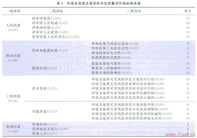 專家組根據(jù)環(huán)境及地質(zhì)災(zāi)害專項(xiàng)風(fēng)險(xiǎn)評價(jià)的特點(diǎn),在圖2所示質(zhì)量評價(jià)體系結(jié)構(gòu)的基礎(chǔ)上制訂出一套有針對性的質(zhì)量評價(jià)指標(biāo)體系(表2),其中括號內(nèi)為各指標(biāo)權(quán)重值。