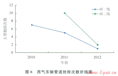 圖7表明,西氣東輸一線管道斷纜頻率由2009年的7.1次/(1090km·a)降至2010年的l.8次/(1000km·a),并呈逐年下降之勢,說明2009年開始逐步實施第三方損壞完整性管理工作后,施工機械等可能威脅管道安全的第三方施工次數(shù)顯著減少,管道安全水平逐步提高。由圖8可以看出,2011年西氣東輸二線投產(chǎn)運行初,在第三方損壞完整性管理指導(dǎo)下光纜中斷次數(shù)處于較低水平,并呈下降趨勢。
