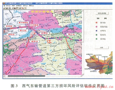 第三方損壞風(fēng)險評估是評定管道沿線居民、施工單位等對管道的意外損傷或故意破壞所引起管道風(fēng)險變化情況的技術(shù)。根據(jù)西氣東輸管道第三方損壞風(fēng)險管理體系,利用自主開發(fā)的西氣東輸管道第三方損壞風(fēng)險評估軟件(圖3)分別于2009年和2011年從沿線社會環(huán)境、居民關(guān)系、管道敷設(shè)狀態(tài)等第三方損壞的敏感因素人手開展第三方損壞風(fēng)險評估工作,更新了管道附近的人口密度和工礦企業(yè)分布、管道違章占壓歷史數(shù)據(jù)和第三方施工等情況,確定了西氣東輸管道第三方損壞的風(fēng)險分布。對比2009年第三方損壞風(fēng)險評估結(jié)果,中等風(fēng)險降低了l9.28%,較高風(fēng)險增加了22.15%,揭示了管道沿線經(jīng)濟發(fā)展、人員活動增加等影響第三方損壞防控的因素正在不斷增多。